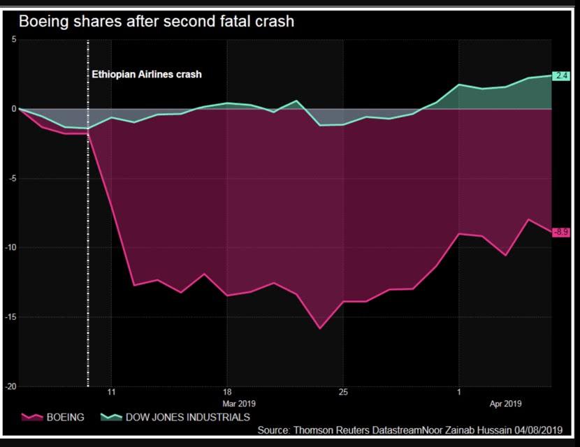 自今年3月10日埃塞航坠机事故以来,波音股价从3月11日收盘400.01美元/股下跌至4月8日收盘374.52美元/股,跌幅达6.4%,市值蒸发144亿美元。
