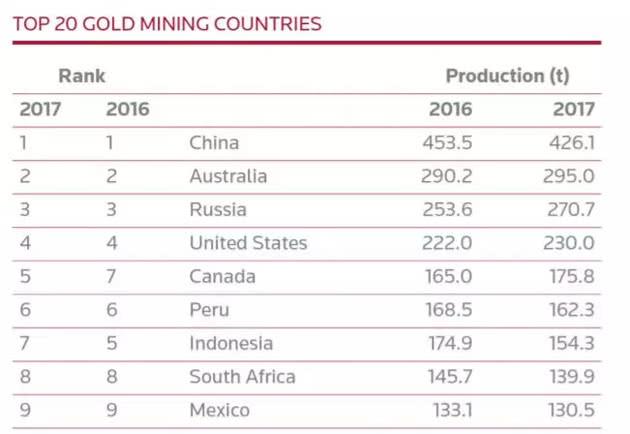 根据2018年GFMS黄金年鉴显示,2017年,全球黄金据报为3246.5吨,这一数字比前一年下降5吨,这是自2008年以来首次出现金矿产量下降。