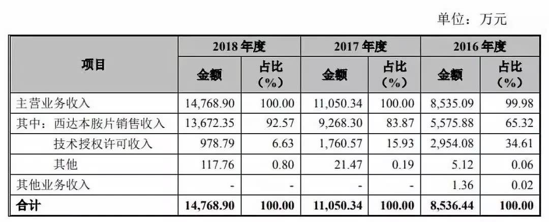 据招股说明书,公司的主营业务收入主要来源于西达本胺片的销售收入和技术授权许可收入,三年的总占比均超过99%,是当之无愧的支柱型产品。