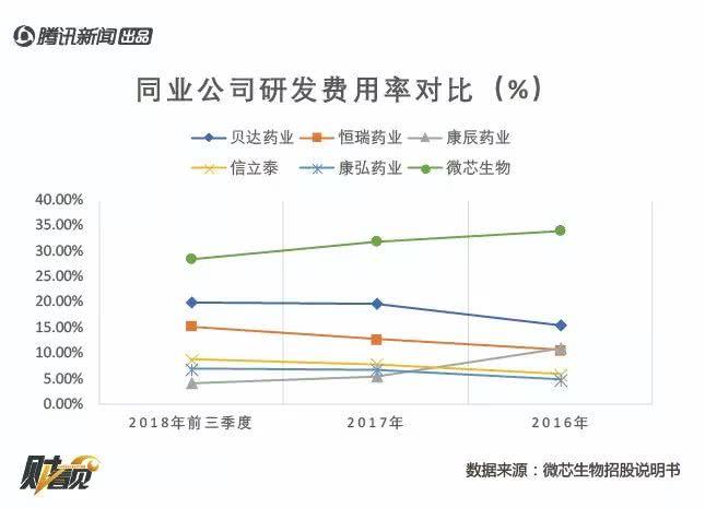 和同行业的上市公司相比,微芯生物的研发费用率处于较高的水平。2018年前三季度28.51%的研发费用率,远高于行业平均值11.06%,这说明公司本身还处于创新的投入阶段,尚未进入成熟期。 一来处于上升期的公司,营业收入规模相比同行业其他公司较小,二来公司的核心竞争力是原创,导致研发投入较大。